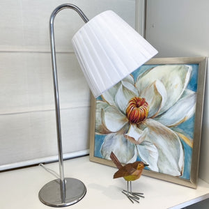 Moderna lámpara metal cromada de escritorio con su pantalla blanca plisada. De diseño simple y armonioso, permite iluminar en forma directa el trabajo desarrollado en la intimidad de tu escritorio. También es factible como lámpara de velador, para lectura nocturna.